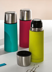 De thermosfles is gemaakt van een dubbele RVS wand en heeft een zachte rubberen coating met een mat gekleurde afwerking.