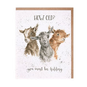 Wens iemand een fijne verjaardag met deze kaart met drie geitjes en de tekst: 'Hoe oud? Je maakt zeker een grapje'. De afbeelding is gedrukt op duurzaam geproduceerd structuurkarton en wordt geleverd met een gerecycled kraftpapier-label.