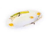De schaal is gedecoreerd met opliggende asperges en heeft 2 uitsparingen voor eitjes.
