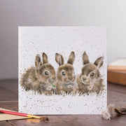 Met drie artistiek afgebeelde konijnen die aan madeliefjes knabbelen, is deze kaart perfect voor elke gelegenheid.